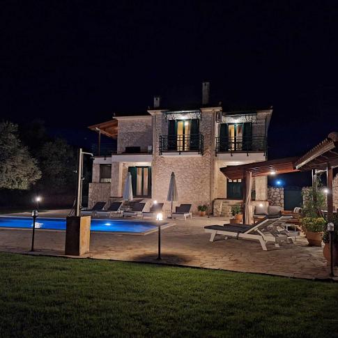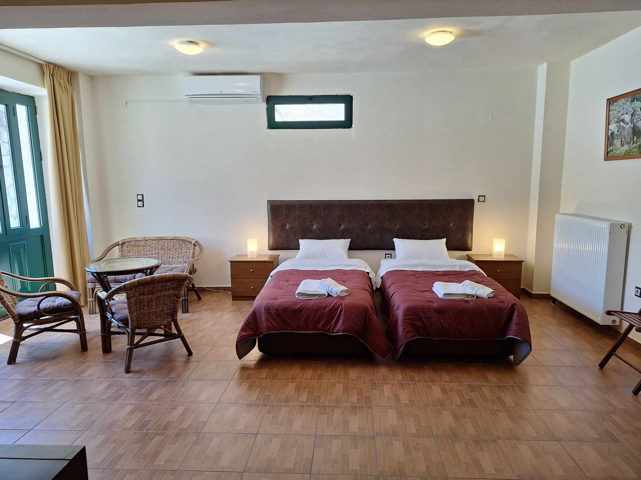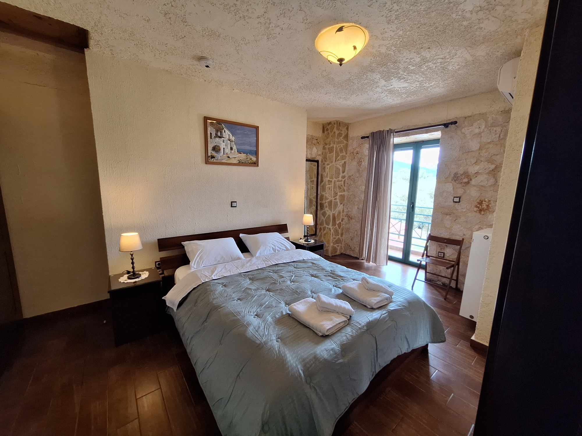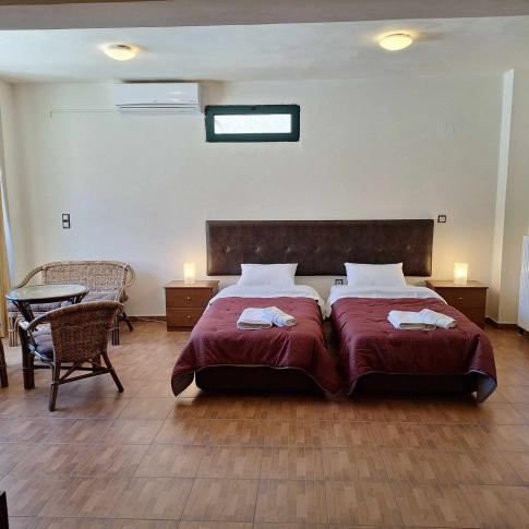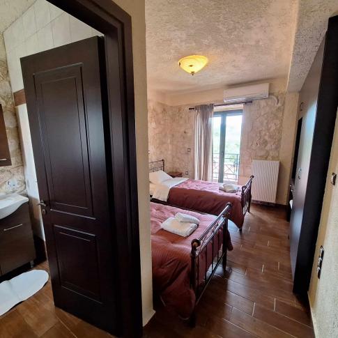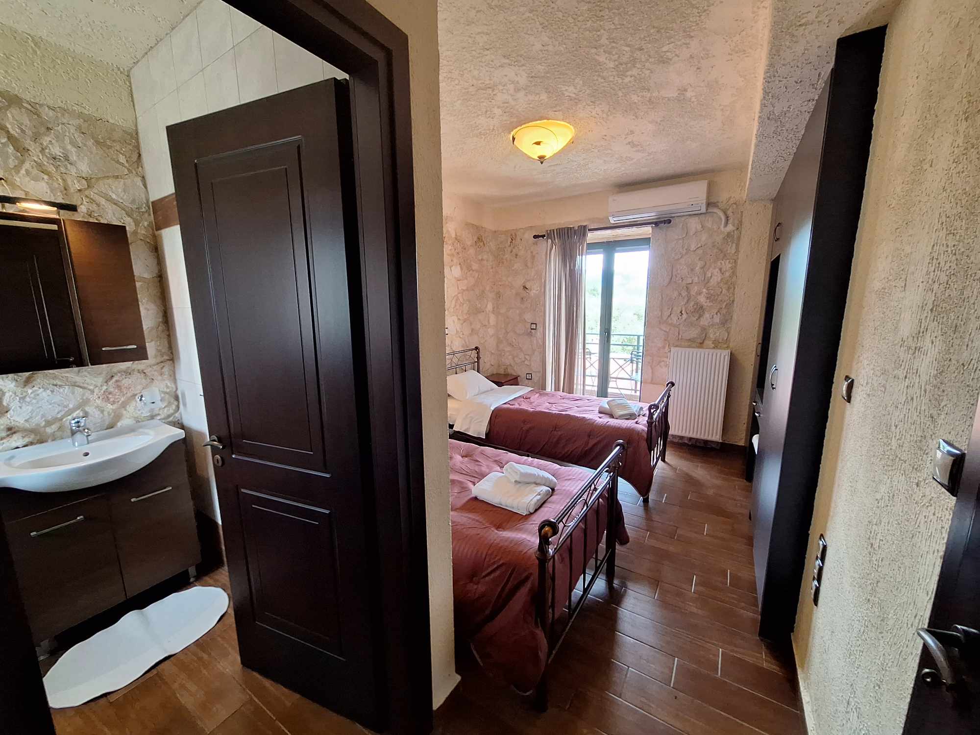Στον πρώτο όροφο υπάρχουν 2 κρεβατοκάμαρες με αυτόνομο μπάνιο. Η μία με 2 μονά κρεβάτια και η άλλη με ένα διπλό.